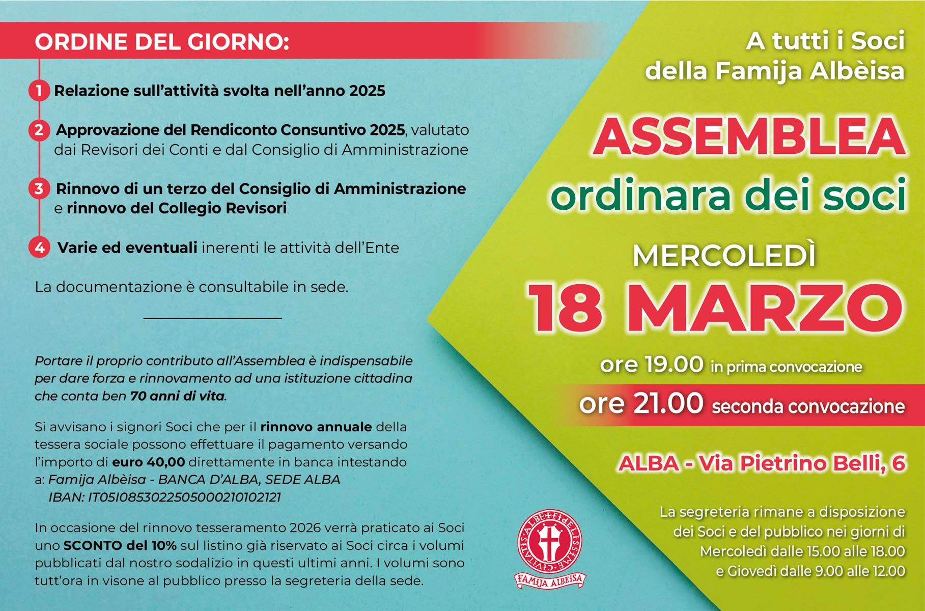 Nel corso dell’Assemblea Generale dei soci, tenutasi martedì 23 aprile presso la sede della Famija Albèisa, i soci hanno provveduto ad approvare il...