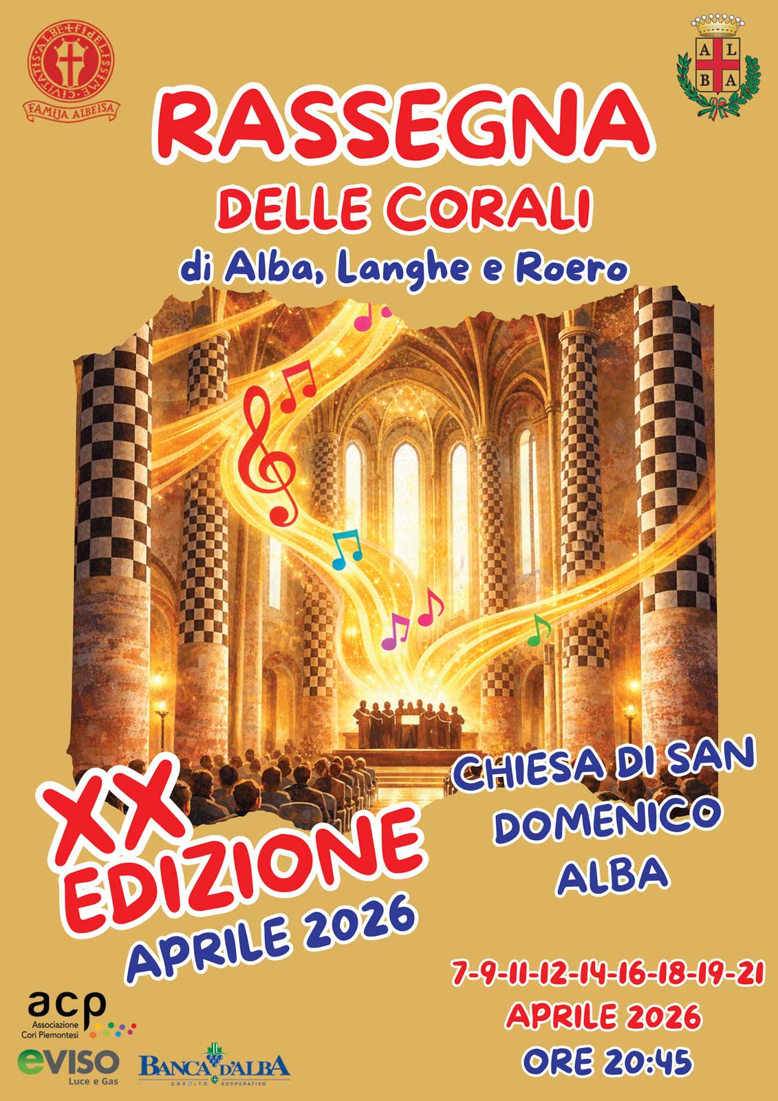 Rito rna l’apprezzata manifestazione della Rassegna delle Corali in San Domenico ad Alba giunta ormai alla ventesima edizione. Si esibiranno nei loro tradizionali repertori i Cori popolari dei paesi di Langa e Roero insieme con le corali albesi. Ormai da due anni aderiscono alla Rassegna anche gruppi canori provenienti da paesi di oltre provincia e dal Basso Piemonte