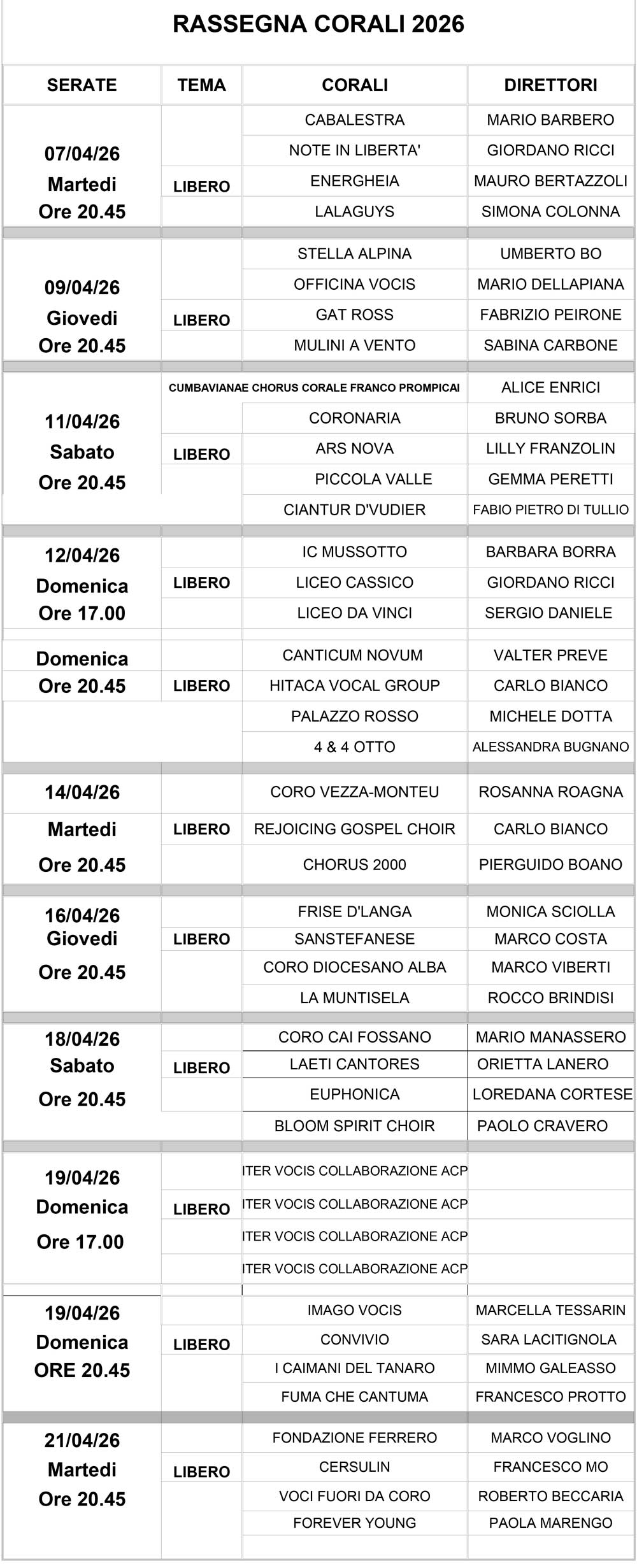La Rassegna torna ad inaugurare la primavera albese durante il mese di Aprile 2026. Sono state programmate nove serate che ospiteranno le oltre 40 corali provenienti dalla diverse forme di aggregazione appassionati del bel canto .